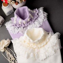 高领套头毛衣女蕾丝边钉珠长袖针织打底衫短款修身加厚毛衣外套冬