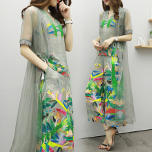 2017夏季新款韩版印花V领雪纺衫A字两件套连衣裙时尚套装女