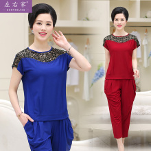 妈妈装夏装套装2017新款中老年t恤衫大码中年女装七分裤休闲两件