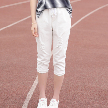 琵琶语少女装夏装新款韩版直筒牛仔裤磨破松紧初高中学生七分裤女