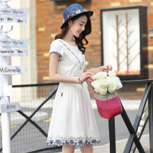 2017夏装新款连衣裙少女韩版修身显瘦A字裙圆领绣花初中学生裙子