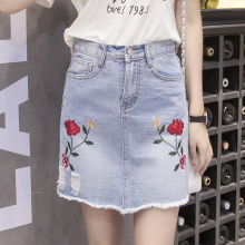 春夏高腰刺绣花朵a字裙包臀牛仔半身裙女 显瘦短裙防