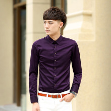 芃予秋装新款男士纯色修身长袖衬衫时尚韩版紫色衬衣男休闲衬衫潮