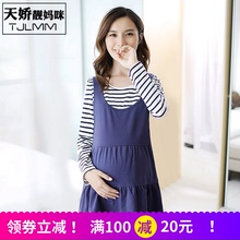 孕妇装春装新款条纹长袖中长款T恤搭背心连衣裙两件套套装春季