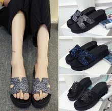 2016夏季新款韩版厚底防滑沙滩鞋平底松糕跟凉拖亮片一字拖鞋女潮