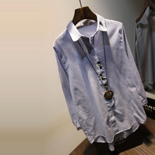 韩国馆直供2017韩版女装春装新款显瘦竖条纹米奇印花休闲白衬衫潮