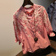 欧洲站直供春装新款棉麻刺绣衬衣文艺复古绣花长袖打底条纹衬衫女