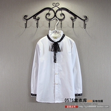 欧美风17春秋款女童中长款衬衫白色蕾丝翻领长袖打底衬衣中大童装