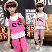 FC女孩中大童女装夏装2017女童套装儿童衣服女短袖运动中裤三件套