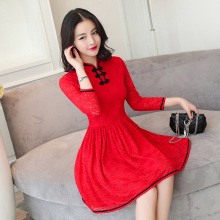 2017新款撞色七分袖盘扣改良旗袍领蕾丝复古连衣裙蓬蓬裙a字裙春