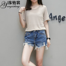 欧洲站冰丝针织衫短袖女套头夏季薄款打底衫圆领半袖t恤女上衣潮