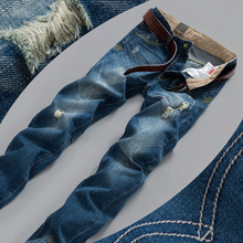 新款韩版小脚牛仔裤男装修身显瘦刮烂猫须弹力青年牛仔长裤子