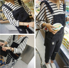 加肥加大码女装春夏装连体裤牛仔胖mm200斤九分裤破洞女裤背带裤