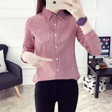 春季新款衬衫女长袖女装韩范宽松大码竖条纹纯棉学生打底衬衣文艺