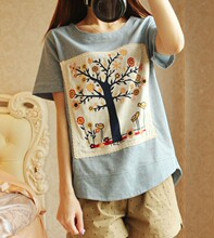 2017夏装新款森女系小清新印花贴布花边棉麻短袖女T恤 夏女短袖