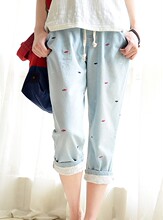 森女系可爱刺绣字母粉色卷边宽松小脚裤 大码牛仔裤长裤子女学生