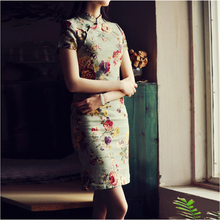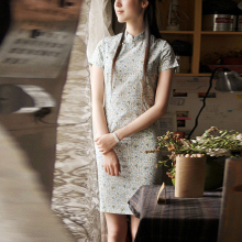 茉茉旗袍夏季连袖短袖短款复古文艺日常改良印花棉亚麻旗袍小白花