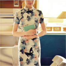 MOMO_TOBO夏新品复古碎花大花印花 改良棉麻亚麻旗袍-水墨 墨蝶