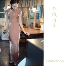茉茉旗袍春夏季连袖无袖中长款复古文艺纯色真丝丝绒旗袍丝绒时光
