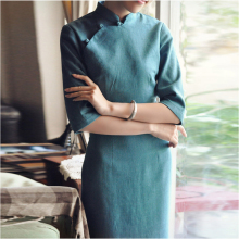 茉茉旗袍 初春 六分装 纯色竹节亚麻 文艺日常中长款旗袍 孔蓝