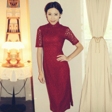 茉茉旗袍 春夏都市通勤四分短袖中长款复古蕾丝旗袍 纯色酒红镂花