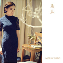 茉茉旗袍春夏四分短袖中长款复古日常通勤蕾丝旗袍 纯色藏青镂花