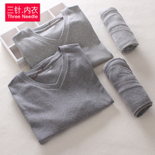 三针舒绒男士纯棉V领秋衣秋裤全棉毛衫薄款保暖内衣套装打底内衣