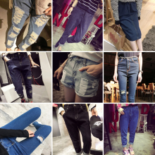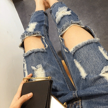 2017韩版新款大破洞流苏磨边水洗牛仔宽松小脚长九分裤潮秋夏女潮