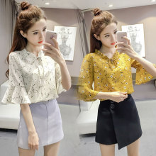 碎花雪纺衫女2017春季宽松显瘦短袖V领衬衫学生百搭喇叭袖上衣夏