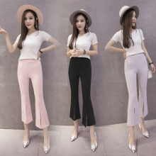 2017春季新款韩版显瘦开叉微喇叭裤女九分裤高腰学生阔腿女裤子夏