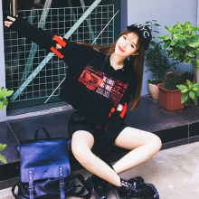 春夏新款韩版圆领短袖T恤女原宿风BF条纹印花上衣学生宽松打底衫