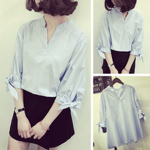 小彬2017韩版文艺清新竖条纹宽松显瘦V领套头衬衫女休闲上衣