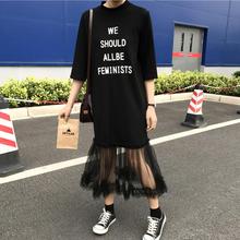 2017春夏新款韩版宽松字母印花拼接蕾丝中长款连衣裙女学生T恤裙