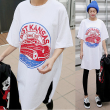 2017春夏天宽松大版卡通印花T恤裙女中长款开叉半截袖t恤上衣潮血