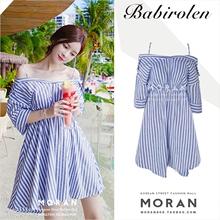 2017夏韩国吊带露肩一字领蓝白条纹连衣裙小清新度假A字收腰棉麻