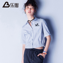 乐瓣2017夏装新款短袖衬衫女短款POLO领上衣单排扣条纹百搭衬衣潮