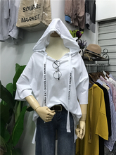 2017春夏装新款 韩版BF风休闲宽松字母织带宽松T恤女中长款帽衫