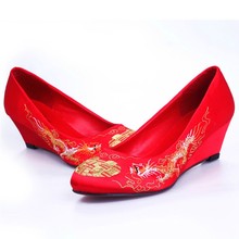 红色新娘绣花高跟鞋 旗袍秀禾服鞋婚鞋秀和服喜字坡跟鞋 龙凤褂鞋