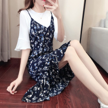 碎花吊带裙夏季2017韩版中长款两件套背心套装裙荷叶边鱼尾连衣裙