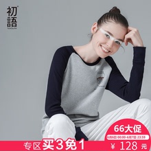 初语2017春装新款 字母爱心印绣撞色插肩袖基础款T恤圆领长袖T恤