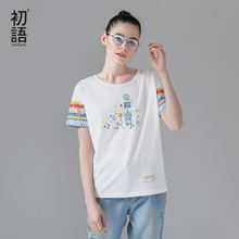 初语女装2017夏装宽松短款打底衫图案印花上衣纯棉白色短袖t恤女