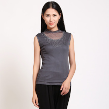查米真丝 女士真丝针织网眼镶钻无袖背心 半高领打底衫气质款