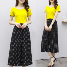 欧洲站时尚套装夏2017新款女装短袖V领T恤圆点阔腿裤休闲两件套女