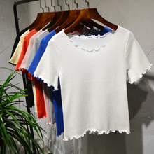 韩版春夏季木耳荷叶边v领纯色修身短款针织衫女喇叭短袖t恤打底衫