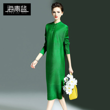 海青蓝2016秋装新款简约纯色褶皱一步裙圆领七分袖开叉宽松连衣裙