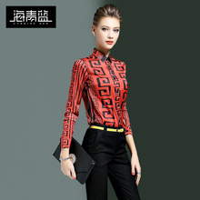 海青蓝2017春装新款欧美时尚印花翻领长袖衬衣修身个性衬衫女6317