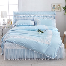 韩版公主蕾丝床裙式床罩式四件套纯色花边球球被套床套多件套1.8m