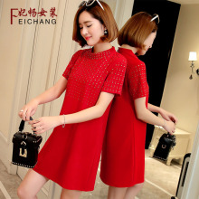 纯色短袖连衣裙女2017春装新款简约中长款镶钻修身显瘦包臀打底裙