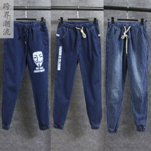 日系原宿风男士印花修身小脚牛仔裤子青少年男生鬼面图案弹力长裤