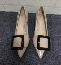 欧美2016春秋新款浅口方扣中跟鞋 漆皮尖头粗跟单鞋时尚百搭女鞋